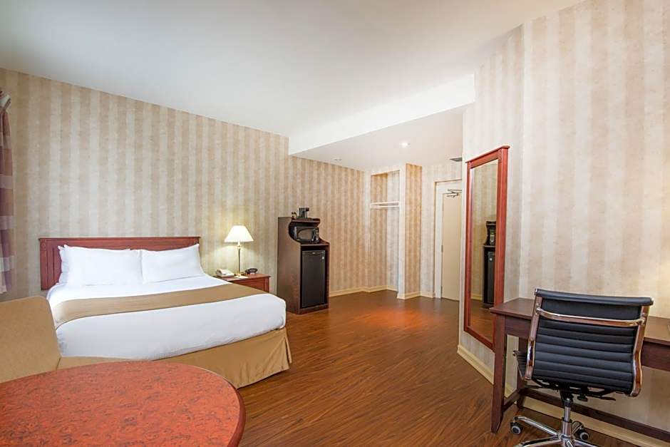 This suite has a separate sleeping and living area. Amenities include free WiFi, a flat-screen TV, microwave and refrigerator.